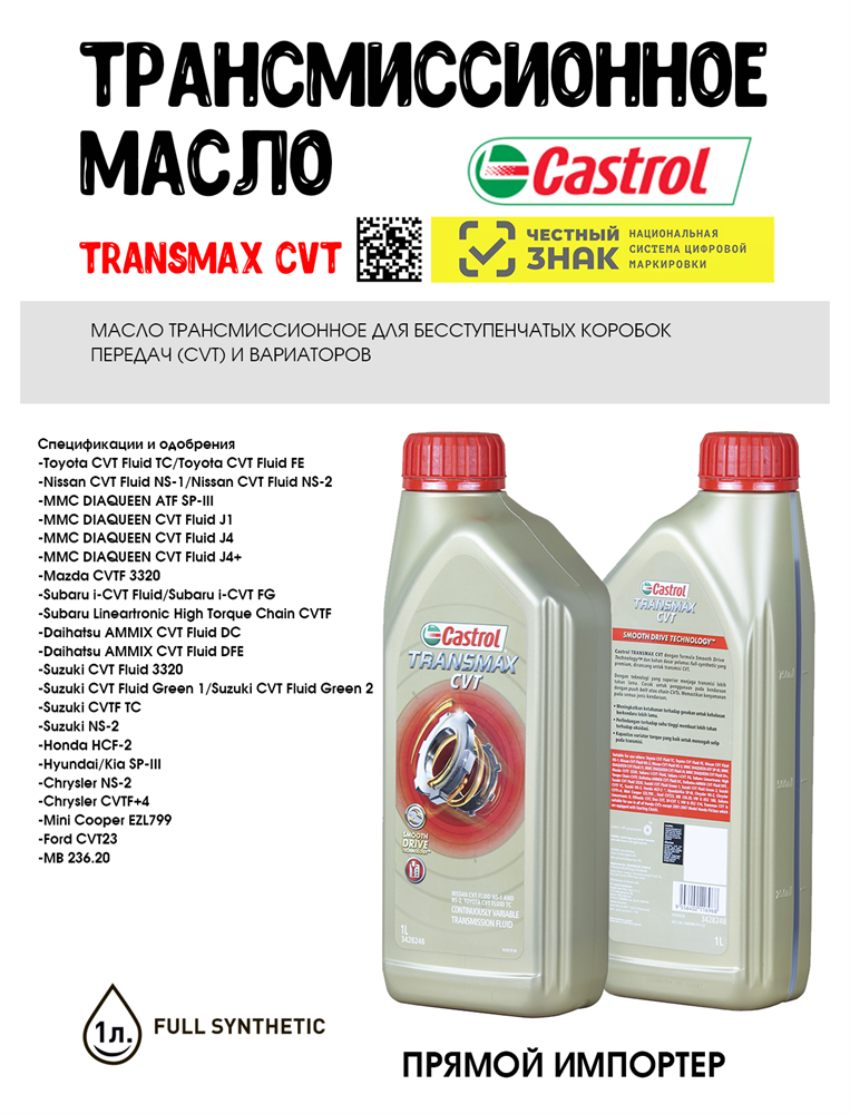 Castrol Transmax CVT - полностью синтетическая жидкость с разработкой “Smooth Drive Technology”ТМ для бесступенчатых коробок передач (CVT) большинства японских легковых автомобилей.
